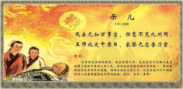 臨終示兒:嘉泰三年(1203年)五月,陸游回到山陰,浙東安撫使兼紹興知府辛棄疾拜訪陸游,陸游成都石刻像 ,二人促膝長談,共論國事。辛棄疾見陸游住宅簡陋,多次提出幫他構筑田舍,都被陸游拒絕。嘉定二年(1209年)秋,陸游憂憤成疾,入冬后,病情日重,遂臥床不起。十二月二十九日(1210年1月26日),陸游與世長辭,享年八十五歲。臨終之際,陸游留下絕筆《示兒》作為遺囑:“死去元知萬事空,但悲不見九州同。王師北定中原日,家祭無忘告乃翁。”