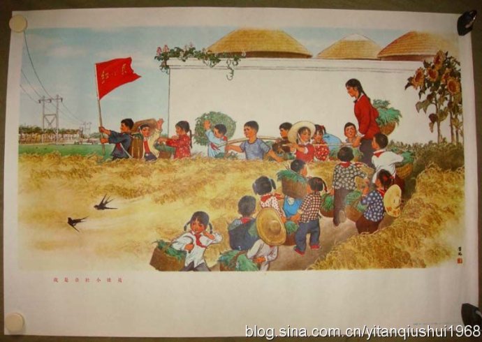 今我何功德,曾不事農桑。 念此私自愧,盡日不能忘。 ”秋水雖然打小不曾事農桑,對分不清麥子韭菜有些羞愧,但記憶深處還是有些往事可回憶: 剛上小學時正趕上文革后期,“工業(yè)學大慶,農業(yè)學大寨”正開展得熱火朝天。為了過個有意義的節(jié)日,六一兒童節(jié)那天,早晨天不亮就起床。穿上長袖褲褂,換上白球鞋,頭戴闊沿草帽,脖子里搭條白圍巾,左肩斜跨個軍用綠水壺,右肩交叉?zhèn)軍挎,手臂上挽個小竹筐,神氣十足地跟在解放軍叔叔后面去附近小營坊生產隊的麥田撿麥穗!(記憶中就是六一那天,大概那年的麥子成熟地比往年早了些吧?)